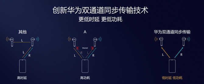 不同于以上两种方式,最新推出的HUAWEI Freebuds 3耳机得益于自研麒麟A1芯片的自研双通道同步传输技术,可以实现两个耳机直接从手机端分别获得左右声道的信号,直接与手机通信,两个耳机之间也规避了干扰。相较以上第二种传输方式,华为自研双通道同步传输大大降低了延时。