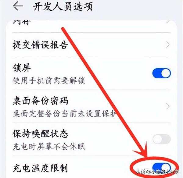 接着在【开发人员选项】中,我们往下滑动,然后就可以看到有一个【充电温度限制】的开关,那么这个时候,我们要找的就是它了,手机充电时之所以会出现温度过高,发热发烫,其实就是这个开关没有打开引起的,所以我们需要手动将它打开,很多朋友都忽略了这一点,甚至根本就不明白还有这个开关!