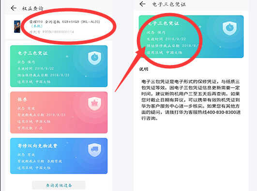 之后可以看到手机的型号和序列号和三包凭证,从三包凭证可以查看到手机激活时间与日期。还可以点击三包凭证详情界面,也可以看到华为手机激活时间。
