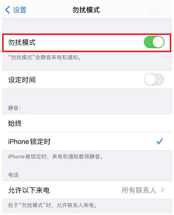 我们在日常生活中,经常被一些陌生电话骚扰。特别是在开车、开会或者与他人用社交软件视频或语音聊天的时候被骚扰,让人非常苦恼。其实我们只要对智能手机进行设置后,便可以实现拒接陌生来电。以苹果手机为例,在“设置”中,开启“勿扰模式”,在“勿扰模式”中,选择“允许以下来电”群组中的“所有联系人”即可。
