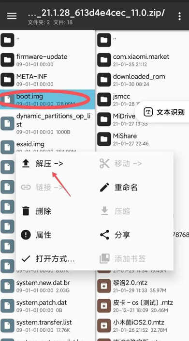 ③ 用MT 管理器(这个可以自己网上下载也可以私信我要下载链接)打开完整包,把boot.img提取出来,右侧记得选一个自己容易找到的解压位置