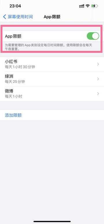 2、选择应用限额-App限额,将右侧的按钮关闭就可以了。