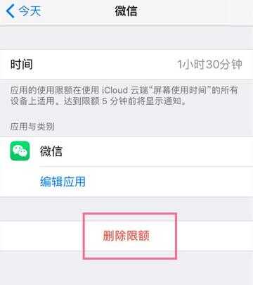 3、如果想要取消某个指定app的限额,我们可以选择该app,再点击删除限额就可以了,或者直接关掉屏幕使用时间。
