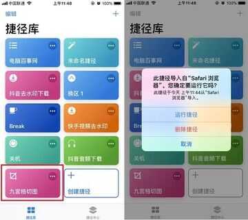 二、使用自带的 Safari浏览器,打开复制好的九宫格切图网址 ,然后点击下方的「获取捷径」,然后在“捷径”中打开,提示中,点击「打开」,之后再点击右上角的「完成」,完成安装,如下图所示。