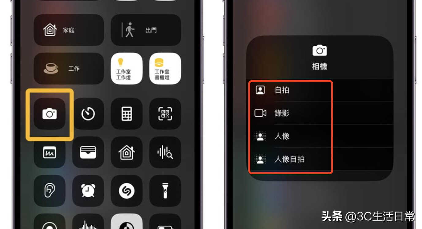 下滑控制中心,长按“相机”,就能自由选择自拍、录影、人像、人像自拍。