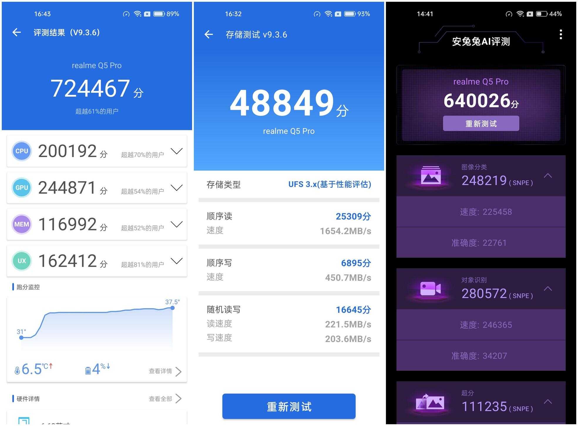 realme Q5 Pro的跑分成绩为724467分,CPU成绩为200192,GPU成绩为244871;存储测试中,随机读取速度为1654.2MB/s,随机写入速度为450.7MB/s,总成绩为48849分;AI跑分成绩为640026分。