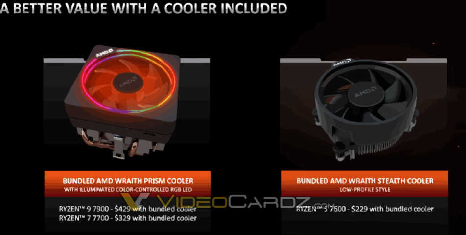 此外,PPT 显示 R9 7900 和 R7 7700 处理器盒装版配备名为“Wraith Prism”的 RGB 散热器,R5 7600 处理器盒装版将配备名为“Wraith Stealth”的普通散热器。