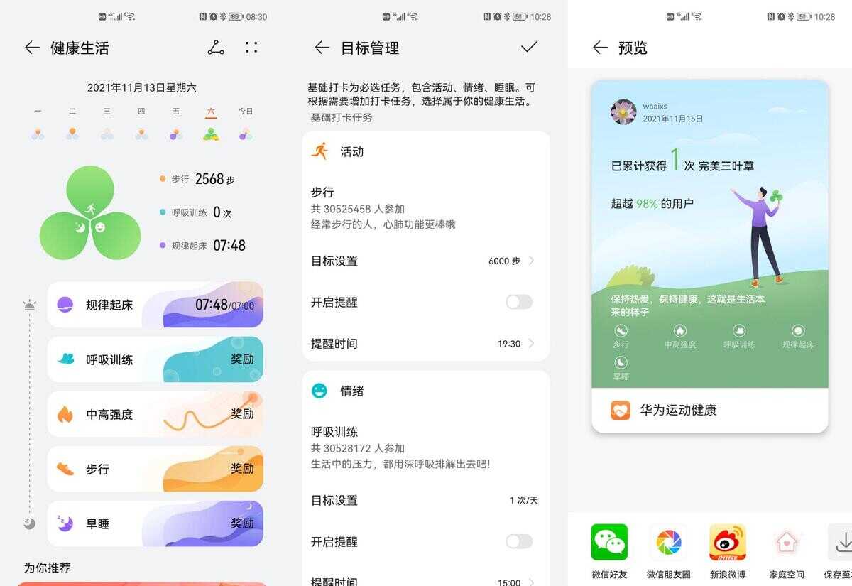 当然,华为WATCH GT3还对原有功能进行升级和整合。譬如全新升级的TruSeen™5.0+八通道心率监测技术等。需要强调的是:华为WATCH GT3围绕运动、情绪和睡眠三大维度,开发出“健康三叶草”的全新健康生活模型。你可依据自身情况制定目标(包括起床、运动、呼吸等行为),来规范自己的生活——通过三叶草模型,华为WATCH GT3致力帮助使用者打造健康生活习惯,各位养生爱好者还不来一块?