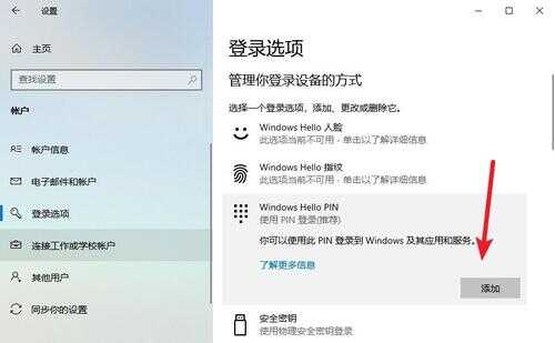 5、 在右侧找到并点击pin码设置选项,点击添加