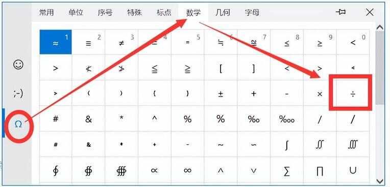 选择符号选项卡后,可以看到最上方的几个类型选项,选择中间位置的“数学”,这时候标准的数学“÷”就是,点击即可插入到你输入的文本里了。