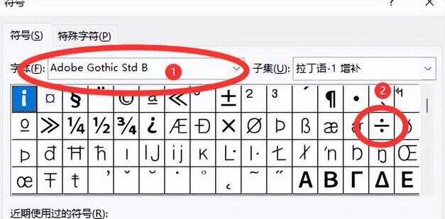 步骤3、并不是所有字体都支持显示数学“÷”的,弹出的“符号”小窗口中,修改字体,在下方列表里就可以找到数学“÷”。如下图所示: