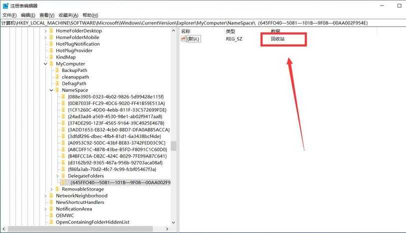 步骤3:在展开的NameSpace文件夹下找到{645FFO40——5081——101B——9F08——00AA002F954E},如果没有的话空白处鼠标右键,选择“新建”——“项”,重命名一个。