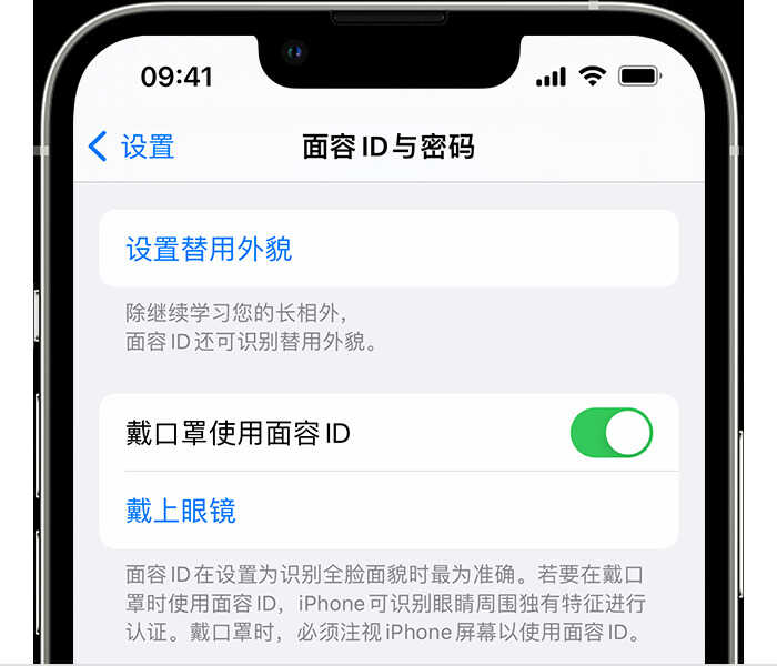如果您戴着眼镜,可以在戴着眼镜的情况下设置面容 ID,以提高“戴口罩使用面容 ID”功能的准确性。您可以在首次设置面容 ID 时或之后完成这一操作。最多可以为面容 ID 添加四副眼镜。