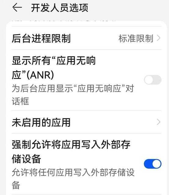 2、进入“开发人员选项”,打开“强制允许将应用写入外部存储设备”。
