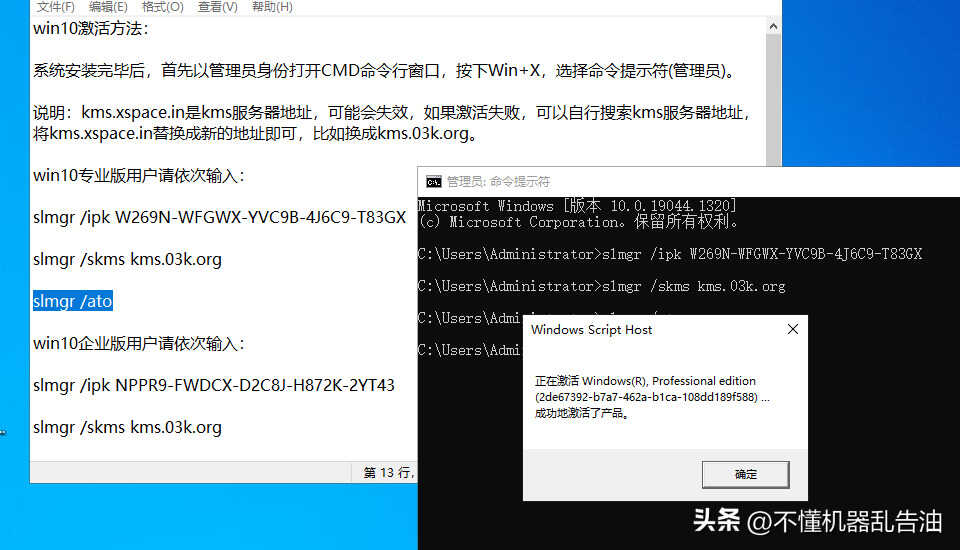 说明:kms.03k.org是kms服务器地址,可能会失效,如果激活失败,可以自行搜索kms服务器地址,将kms.03k.org替换成新的地址即可,比如换成kms.xspace.in,这个不影响激活。