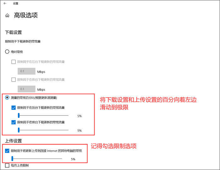 步骤2.然后将其下载的流量百分比拉动到最左侧,同时勾选限制选项,这样一来,系统的自动更新就妥妥的控制住了!