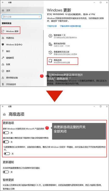 步骤2.在“windows更新”这一块设置这里找到并点击“高级选项”,随后将更新选项的所有开关按钮全部关闭即可。
