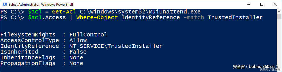 如果TI既不是用户又不是组那它又是什么?查询ACL会给我们一些启示。你可以使用Get-Acl命令来读取一个文件的安全描述,同时我们可以列出TI信息。