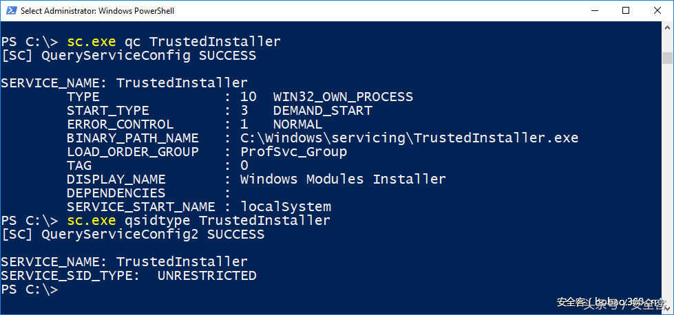 $name = "TrustedInstaller"# Calculate service SID$bytes = [Text.Encoding]::Unicode.GetBytes($name.ToUpper())$sha1 = [System.Security.Cryptography.SHA1]::Create()$hash = $sha1.ComputeHash($bytes)$rids = New-Object UInt32[] 5[Buffer]::BlockCopy($hash, 0, $rids, 0, $hash.Length)[string]::Format("S-1-5-80-{0}-{1}-{2}-{3}-{4}", `$rids[0], $rids[1], $rids[2], $rids[3], $rids[4])当然,你大可不必自己去实现这个方法,NTDLL中有一个RtlCreateServiceSid方法可以做到这一点,同时LSASS中也能把服务名转换成SID。也就是说,当系统资源被更改时,一个名为TrustedInstall的系统服务一定会被运行。我们使用SC模块也能发现这一点。