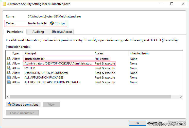 如果你曾管理过windows系统,那么你应该知道trustedInstaller(TI)组的概念,大部分对系统文件和注册表的操作都需要TI组权限。举个例子,你可以看一下System32文件夹下的文件的属性,在安全选项下TI和文件Owner可以删除和修改文件(甚至管理员都不能),所以你不能直接对安全选项进行修改。