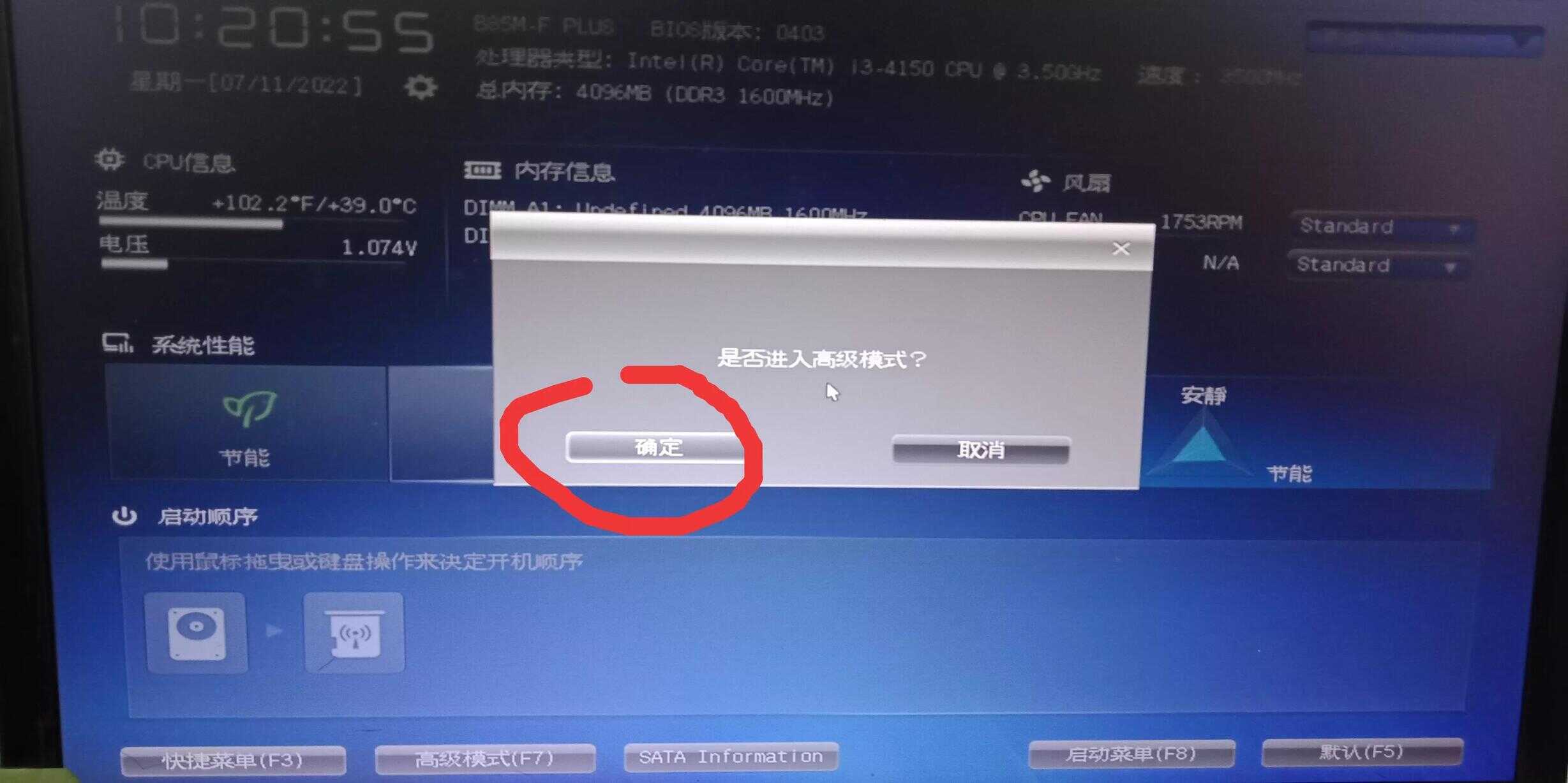 于是我就在电脑按下电源开关后,马上就按键盘上的del键,进BIOS,进BIOS后,再按F7,电脑会问,是否进入高级模式,用鼠标点确定,或者用键盘上的箭头选中确定,然后打回车,就可以看到IDE 和AHCI 的选项了,然后用鼠标或上下箭头选定AHCI后,再按F10保存,电脑就会自动重启,重启后,电脑就可以正常进系统了。