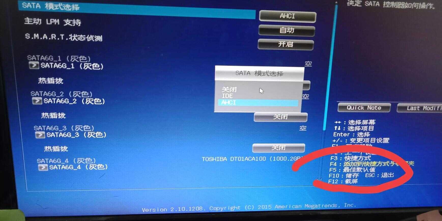 于是,我就仔细看了一下蓝屏代码是0x0000007B,我就用手机搜索如何解决电蓝屏代码为0X0000007B的解决办法,7B之前是6个0,我搜索了一下,网上说是硬盘模式的事,只要把SATA硬盘的IDE模式,改为AHCI,再按F10保存,重启后电脑就好了。