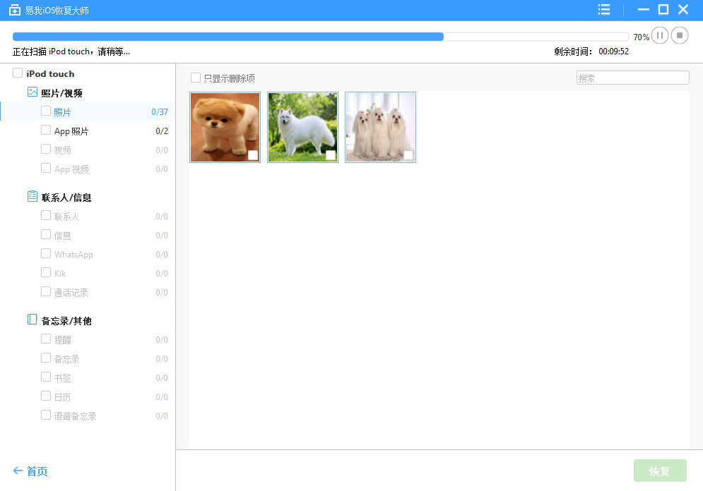 现在可以通过以上步骤开始恢复所有丢失的照片、视频、联系人、消息、Safari书签、便笺、语音备忘录和WhatsApp聊天记录等。