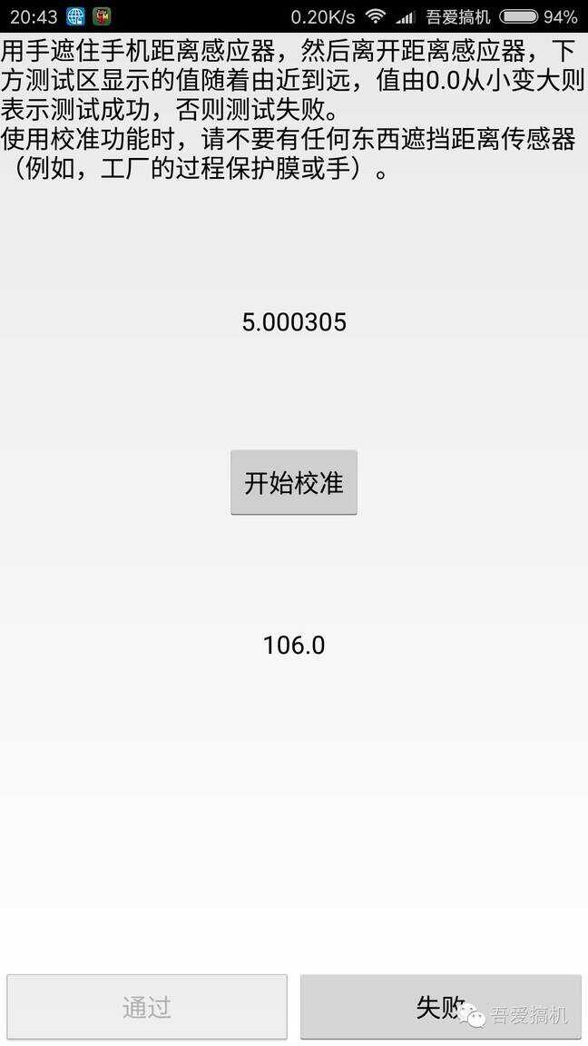 如果挡住和不挡住感应器,上面的数字会随之变化,一般是5和0两个数字的变化,这样证明距离感应器硬件是没有问题的,在不遮挡住感应器的情况下,点击中间的开始校准,稍等几秒钟底部会出现校准通过的字样,证明感应器正确校准,这时候不需要在进行其他操作,直接点击Home键退出桌面即可,这时候尝试拨打电话距离感应器一般就是会正常工作了。