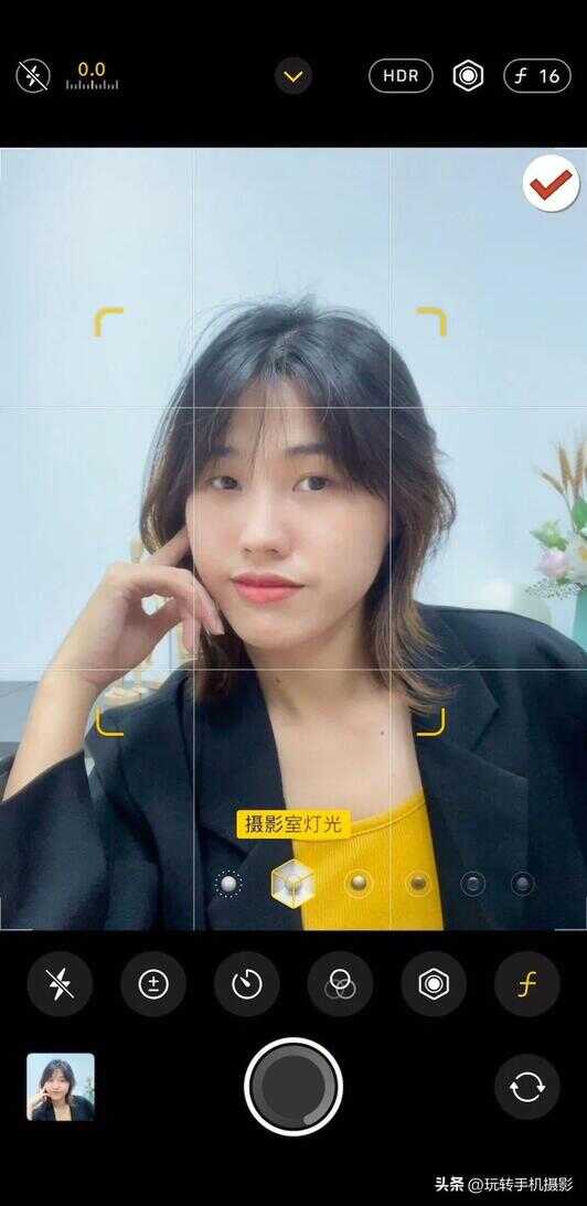 要是选择「人像」模式,我们可以选择「摄影室灯光」,就会有一种自带磨皮美颜的感觉~点击「f」标志能调节背景虚化的深浅,根据自身情况来调节即可。