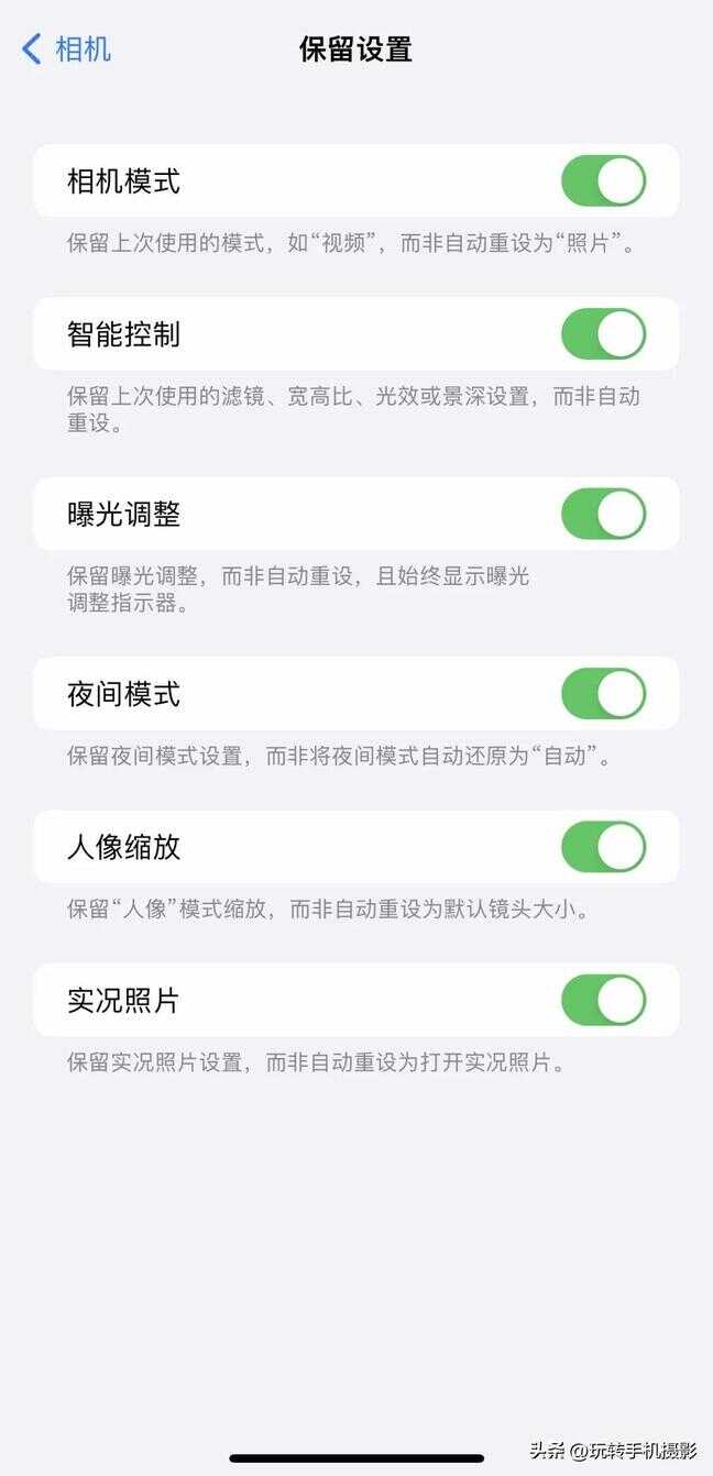 下一步点击「保留设置」,可以把所有模式都打开。其中,「曝光调整」的开启,可以让我们在拍摄时对画面曝光度进行调整,避免画面细节的丢失。