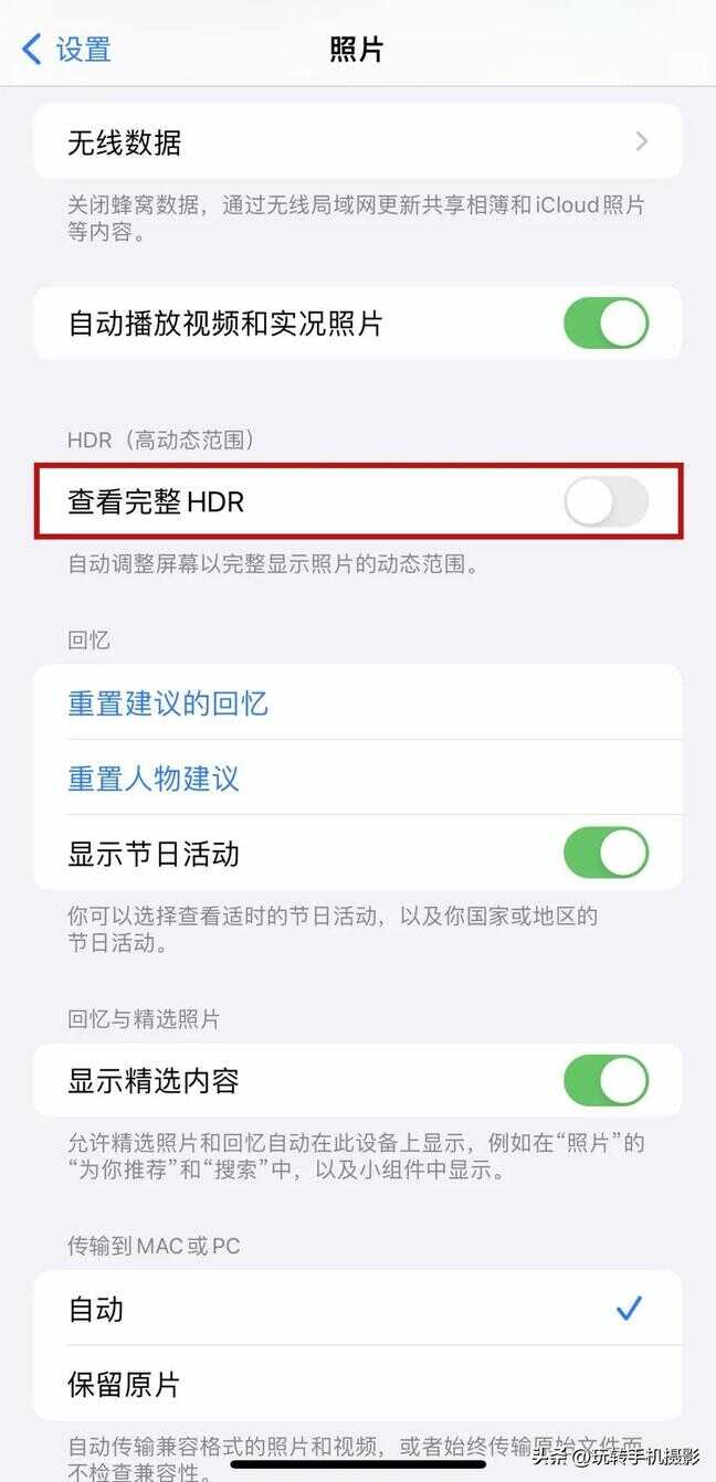 接着找到「照片」,关闭「查看完整HDR」,这样防止拍完照片后,在相册点击预览图放大时会自动变亮。