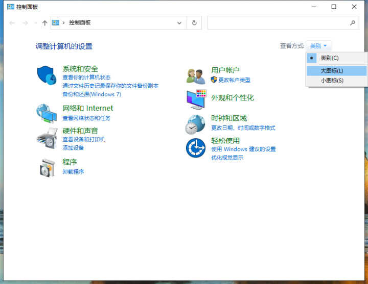 3、点击查看方式之后可以看到有大小图标的选项,我们选择大图标即可。