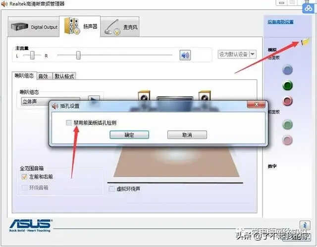 点击右上方的插孔设置“插孔设置”,发现“禁用前面板插孔检测”打勾了取消后,确定就好了!问题就出在这里了。