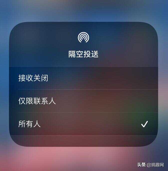 在控制中心中长按“Wi-Fi”图标,可以查看到隔空投送功能,继续长按可进行设置,有三个选项:接收关闭、仅限联系人、所有人。