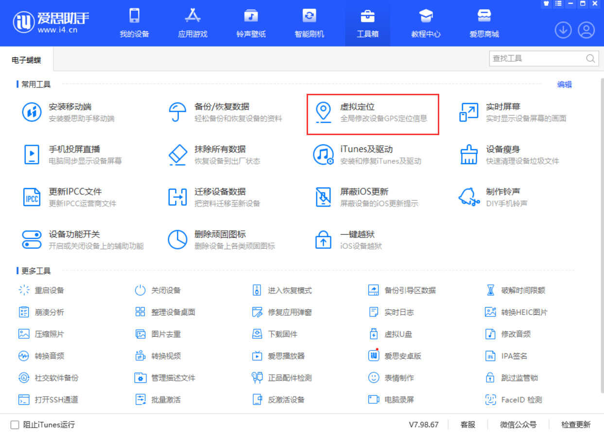 2.轻点爱思助手工具箱中的“虚拟定位”图标打开此功能。