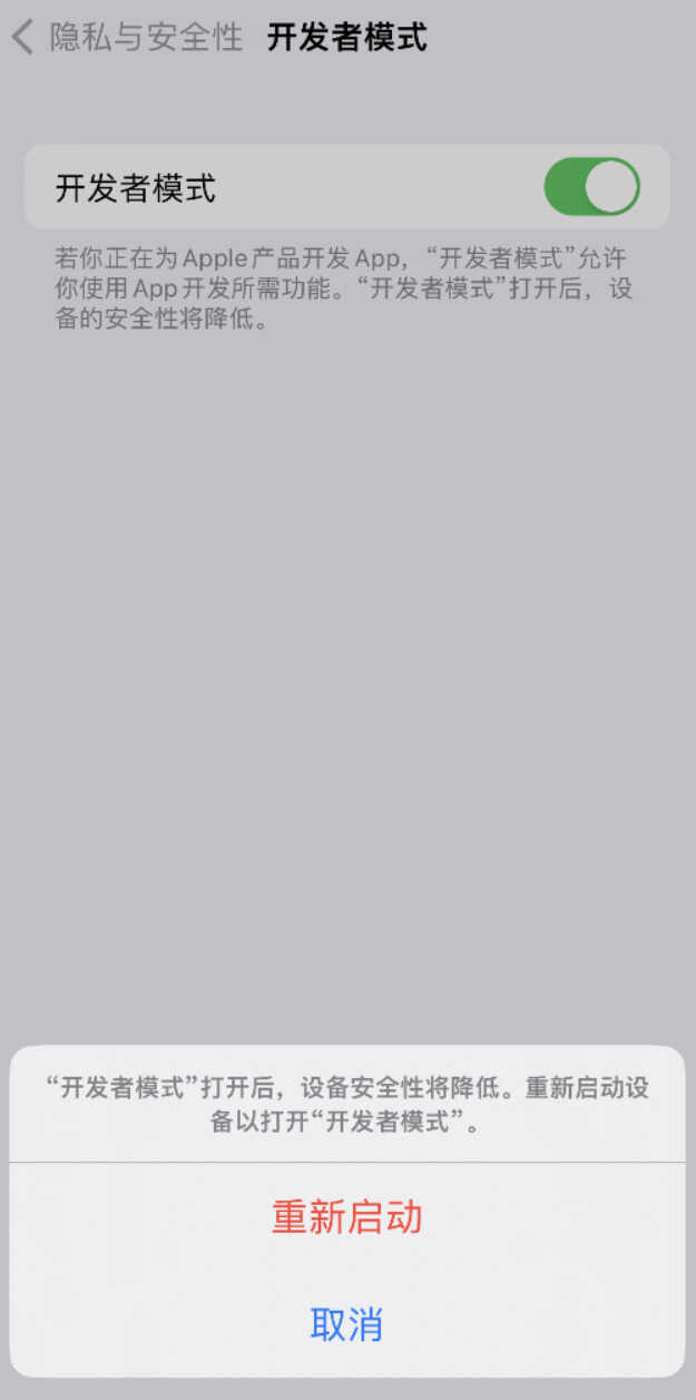 根据提示前往 iPhone “设置”-“隐私与安全性”,可发现“开发者模式”现在已经显示出来,请打开开关并重启设备。
