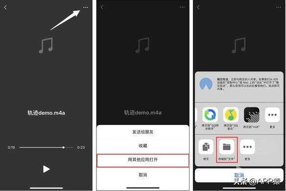 首先把下载好的音乐文件,发送到微信或者qq上,然后点击文件播放。在播放界面右上角,可以看到文件功能按钮,点击即可对该文件进行操作。如图,我们选择「用其他应用打开」— 「存储到“文件”」,将音乐文件添加到「我的 iPhone」本地的文件夹中。