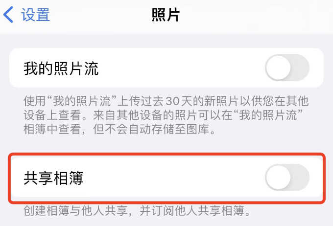 首先我们来看一下照片中的共享相簿,现在唯一的屏蔽方式就是在手机的设置—照片,进入后将“共享相簿”关闭即可。