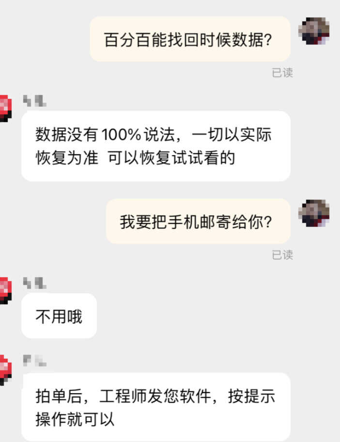 最后提醒大家一点,网络上虽然有很多数据恢复的商家,但大家还是小心点为好。毕竟有许多无良的商家不仅不给你恢复数据,他们可能还会盗取你手机中的数据,或者给你植入木马。