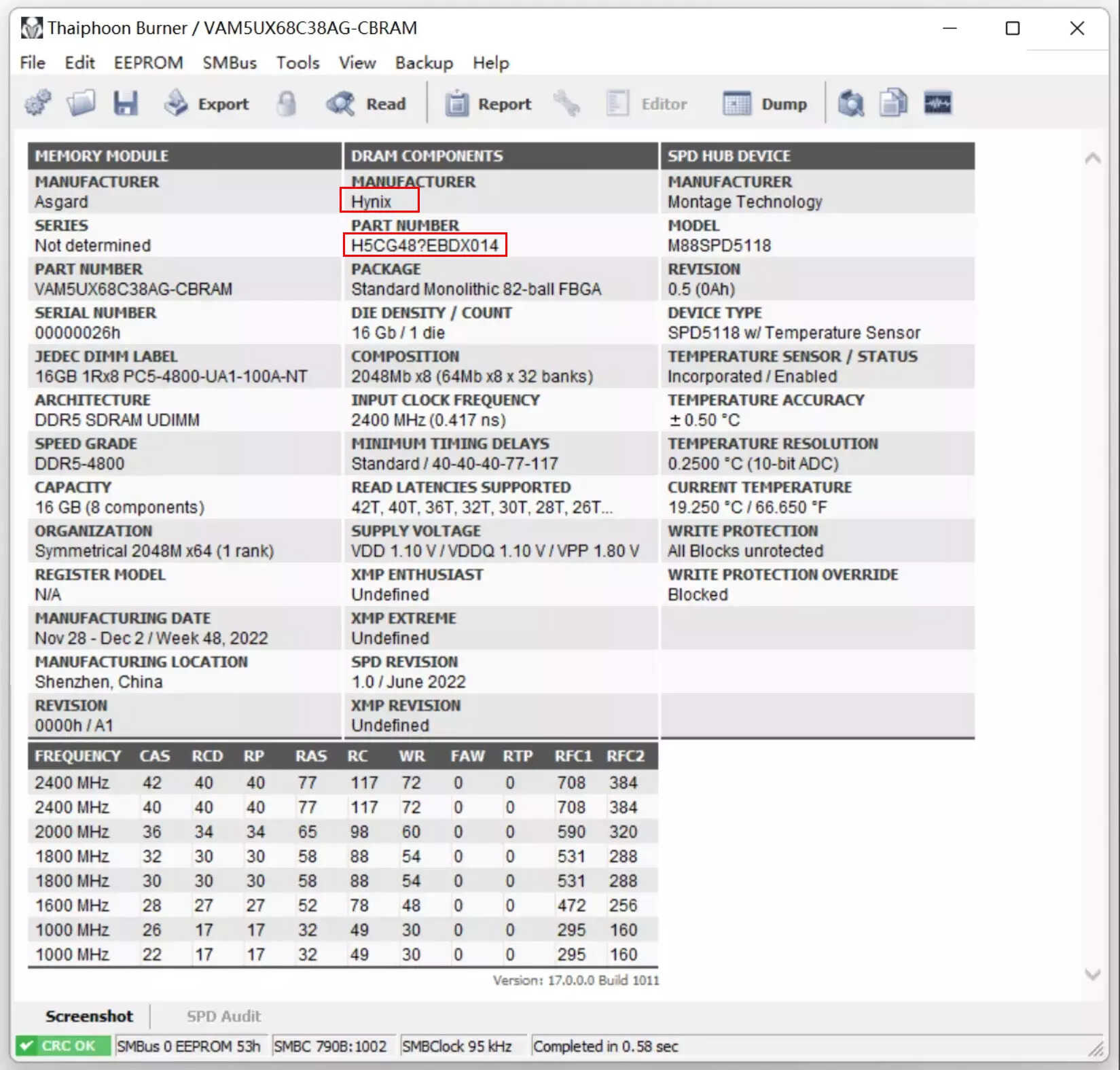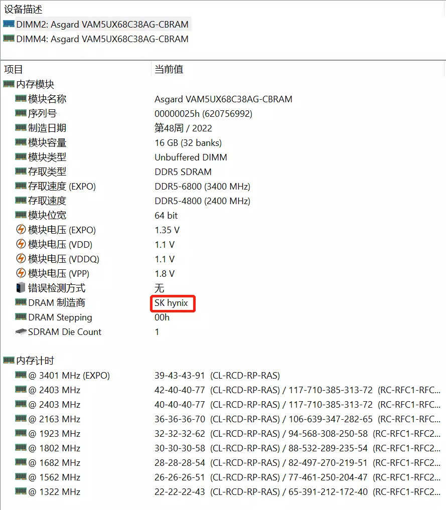 通过台风软件、CPU-Z、AIDA64等软件实测,其颗粒版本为,确定是海力士颗粒无疑。