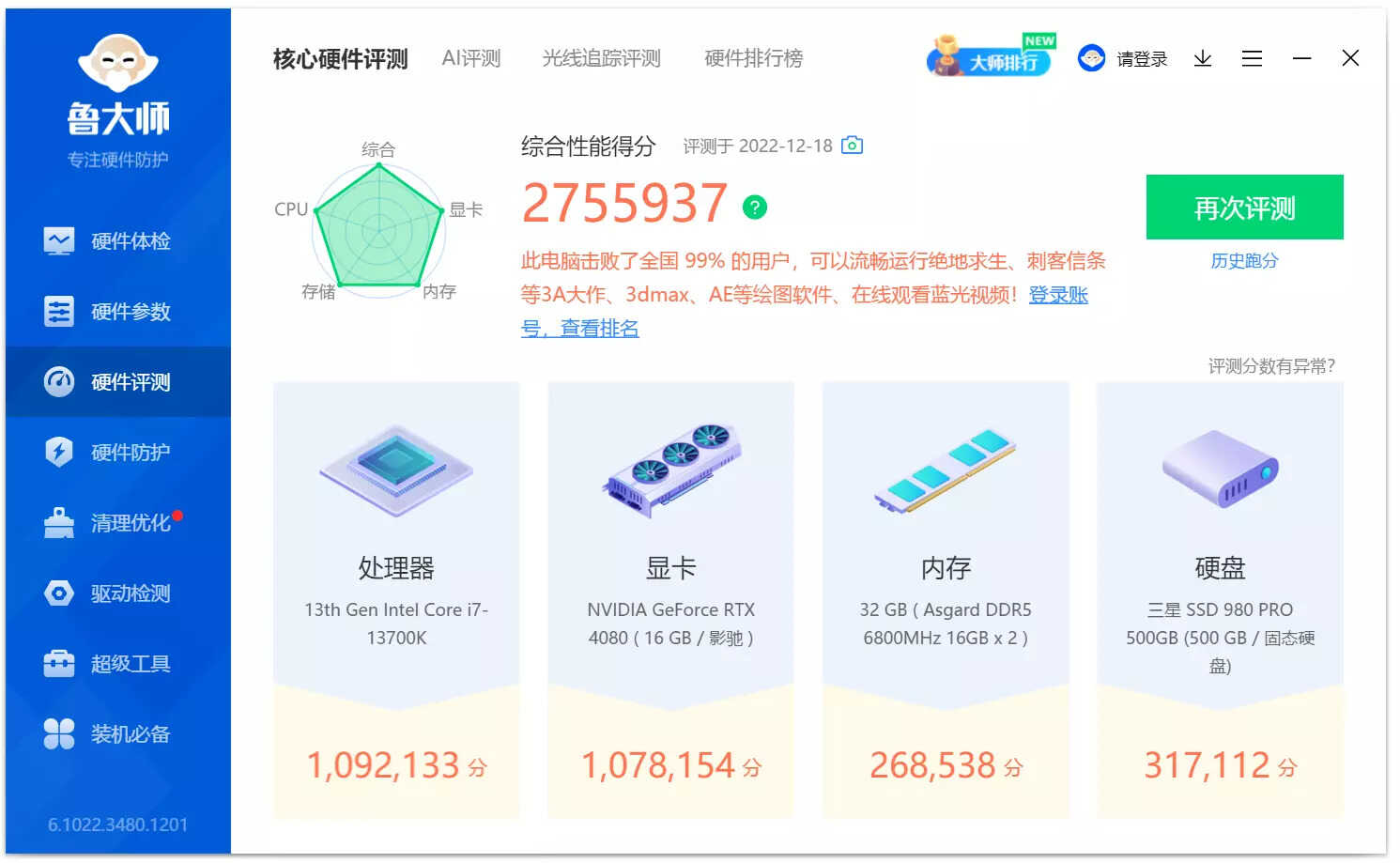 在喜闻乐见的鲁大师跑分方面,阿斯加特博拉琪BRAGI DDR5内存在初始频率4800MT/s下得分为268538分。