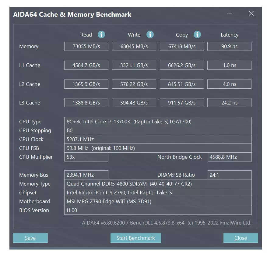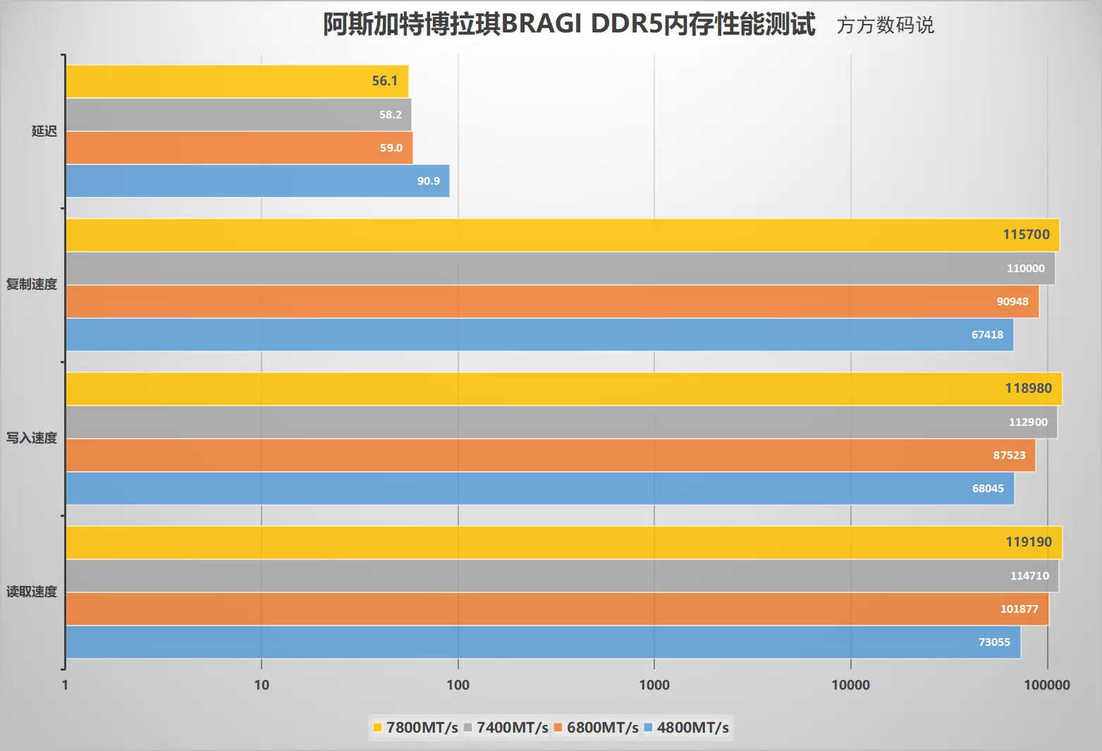 接着来看看跑分,阿斯加特博拉琪BRAGI DDR5内存在初始频率4800MT/s下,时序为40-40-40-77,读取速度为73055MB/s,写入速度为68045MB/s,复制速度为67418MB/s,延迟为90.9ns。正如文章开头所说的,延迟几乎是DDR4时代的1.8倍了。