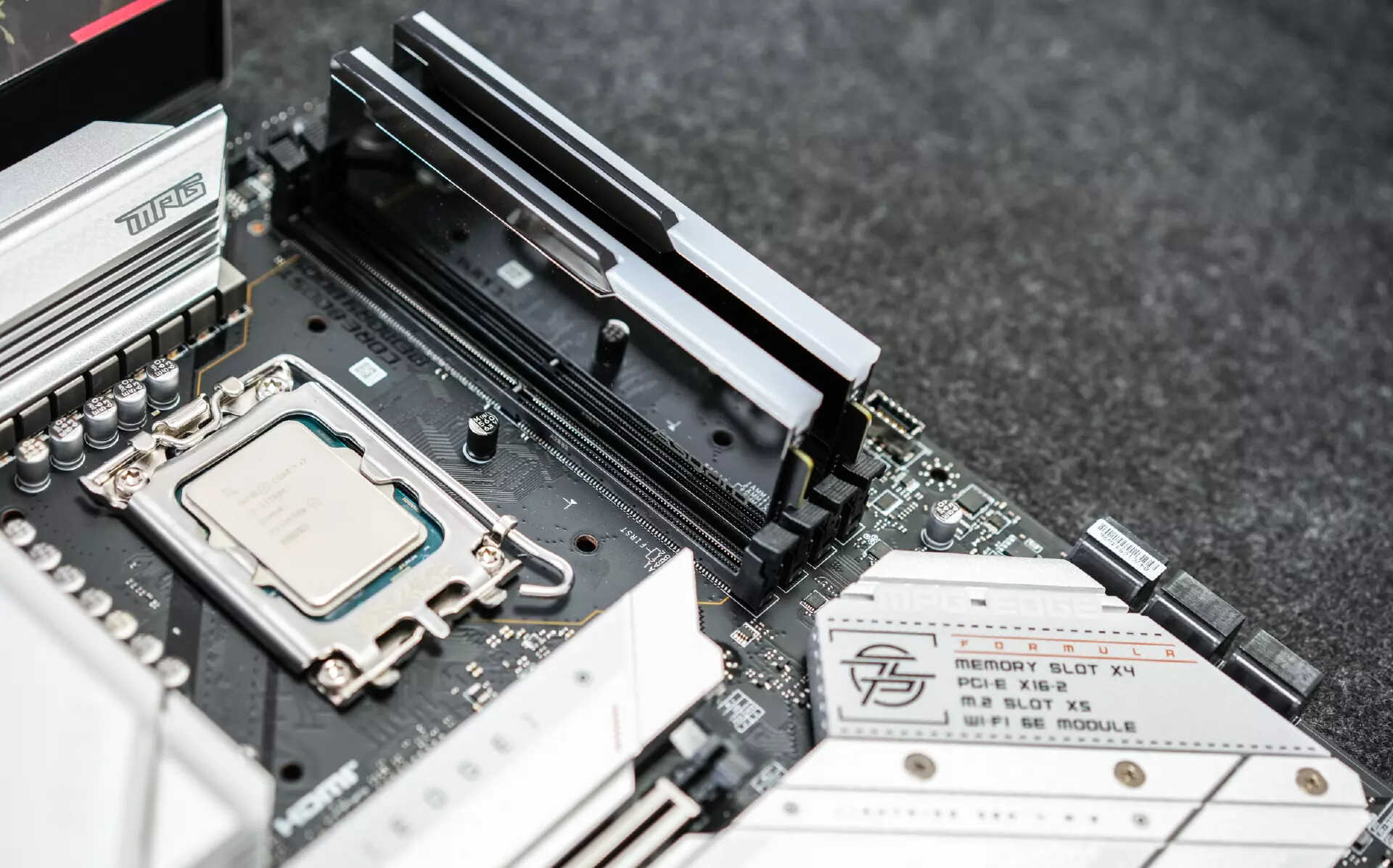 微星MPG Z790 EDGE WIFI主板装好CPU以及阿斯加特博拉琪BRAGI DDR5内存的形态。