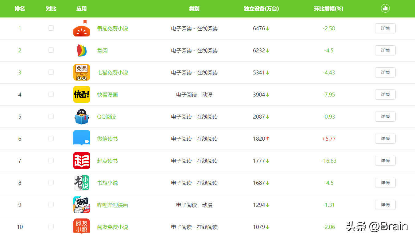 垂直做漫画阅读的快看漫画(又名“快看”)APP以3904万台装机量排名第四,它曾被评为“00后最受欢迎的阅读APP”,看它的装机量就知道不简单;腾讯自家的阅读类APPQQ阅读、微信读书排名第五、第六;起点读书、书旗小说、哔哩哔哩漫画、阅友免费小说依次排名在后。