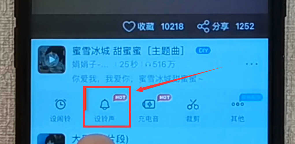 在库乐队界面里,我们就可以看到我们刚才在酷狗铃声里添加的歌曲《蜜雪冰城甜蜜蜜》(如上图),用手指长按它2秒钟,就会弹出下拉菜单(如下图)。