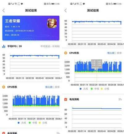 我们使用快否记录游戏的帧数,可以看到《王者荣耀》开启高帧率模式和多核心支持后,游戏长时间保持在60帧,帧数跳动只有0.93帧,高荣耀20 PRO对于《王者荣耀》这款游戏能提供足够的性能支持,能在高帧率模式下流畅运行。