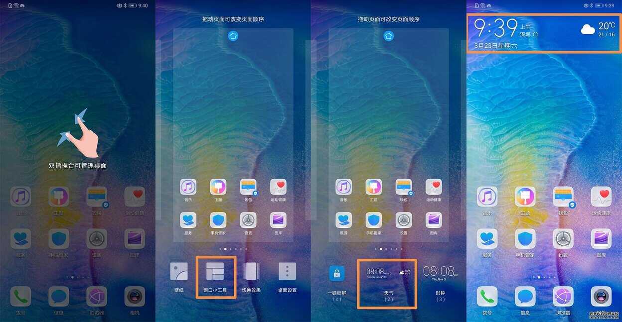 很简单,在桌面空白处长按或者双指捏合屏幕,选择底部的桌面小工具,点击一下或者长按拖移到桌面空位上即可。