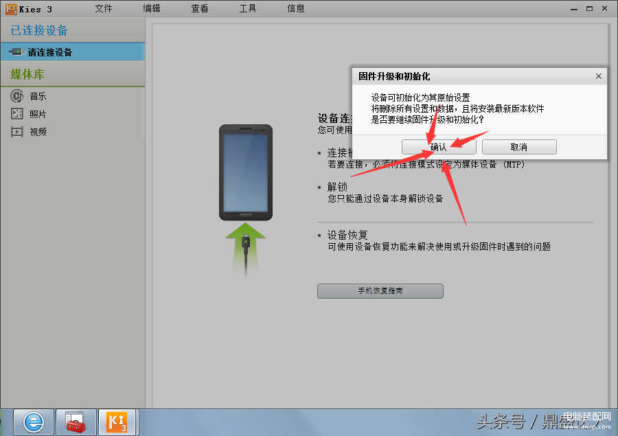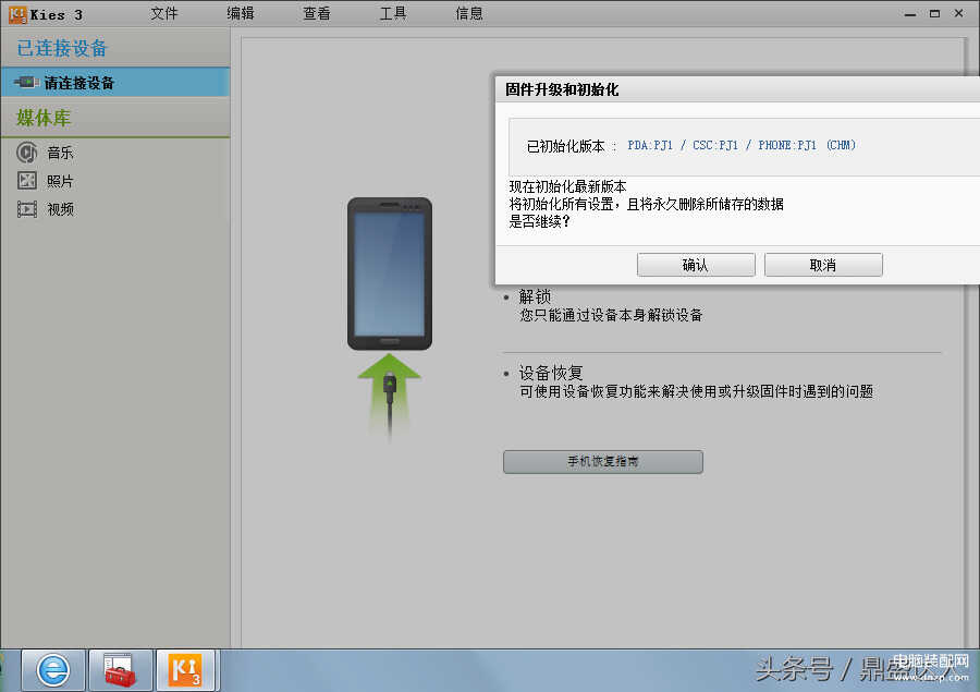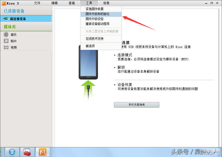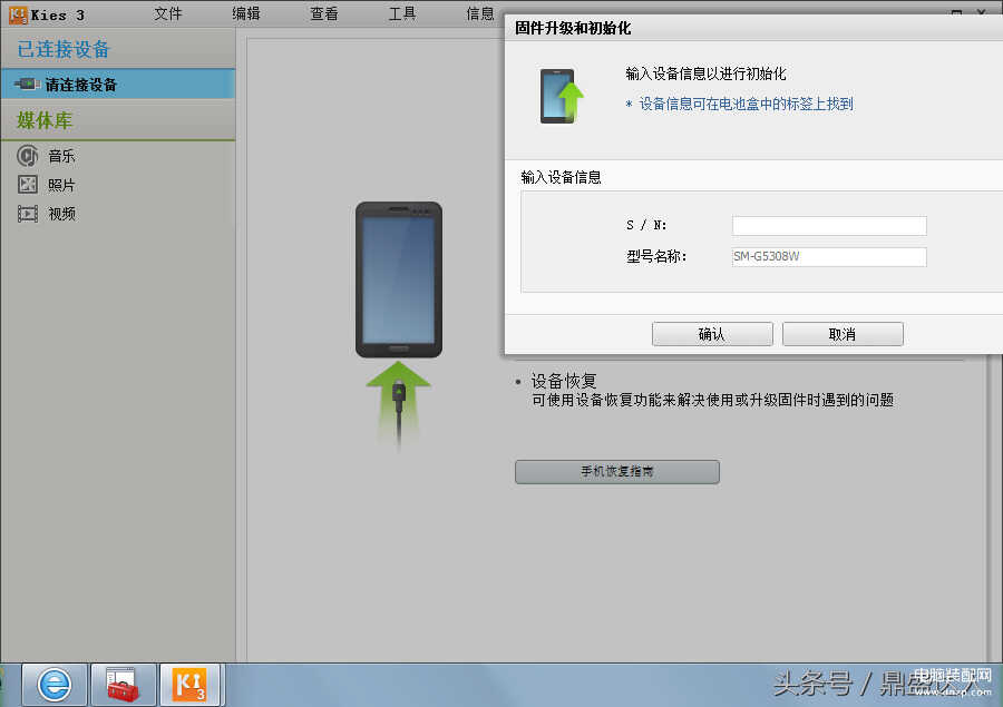 电脑安装kies,三星usb刷机驱动等。打开kies选择工具-固件升级和初始化。然后输入手机型号,在等会输入下面