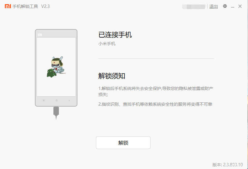 登录刚刚申请解锁的小米账号,然后将手机关机并连接手机,然后同时按住电源键和音量下键进入fast boot模式(米兔模式,又叫挖煤模式)