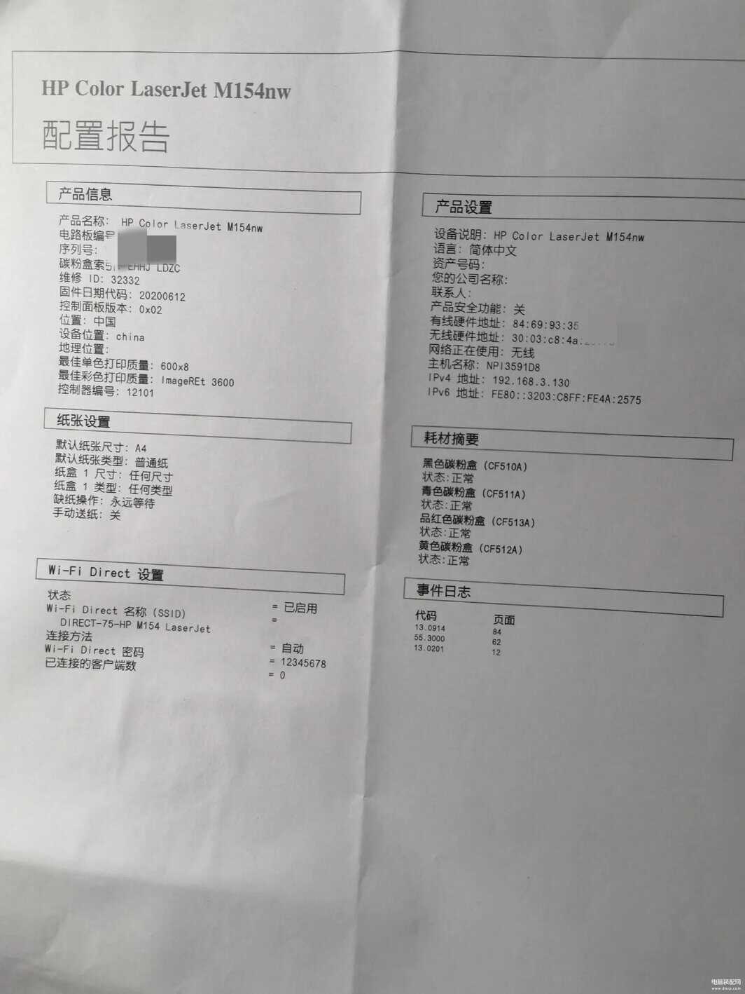 收到打印机后,进行了各种测试,网络连接、无线连接、WiFi连接、USB连接都正常打印,网络连接和无线连接有两个MAC地址,建议这2个MAC路由器设置静态IP,如果不设置,一段时间IP地址变动或IP地址冲突,打印机无法打印,如果是小白的话很麻烦,找不到不打印原因,说不定还得送修。